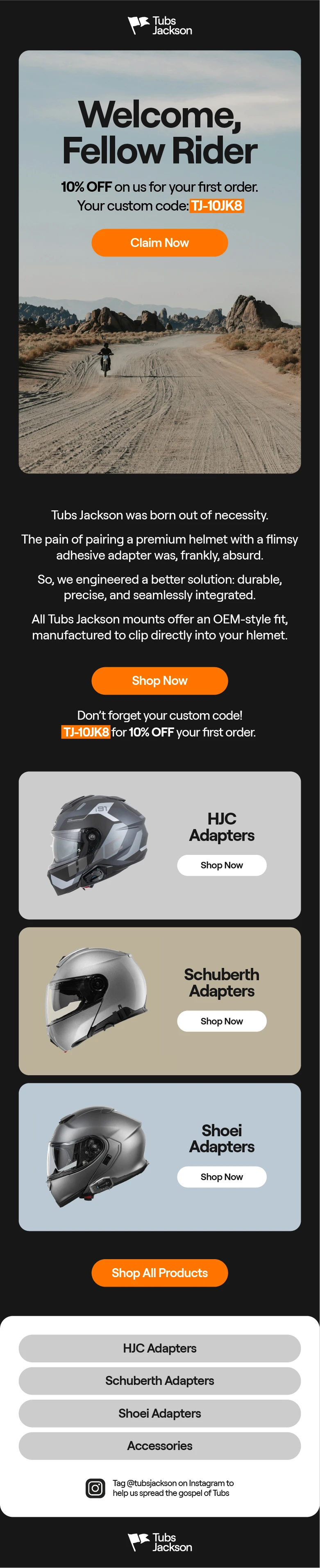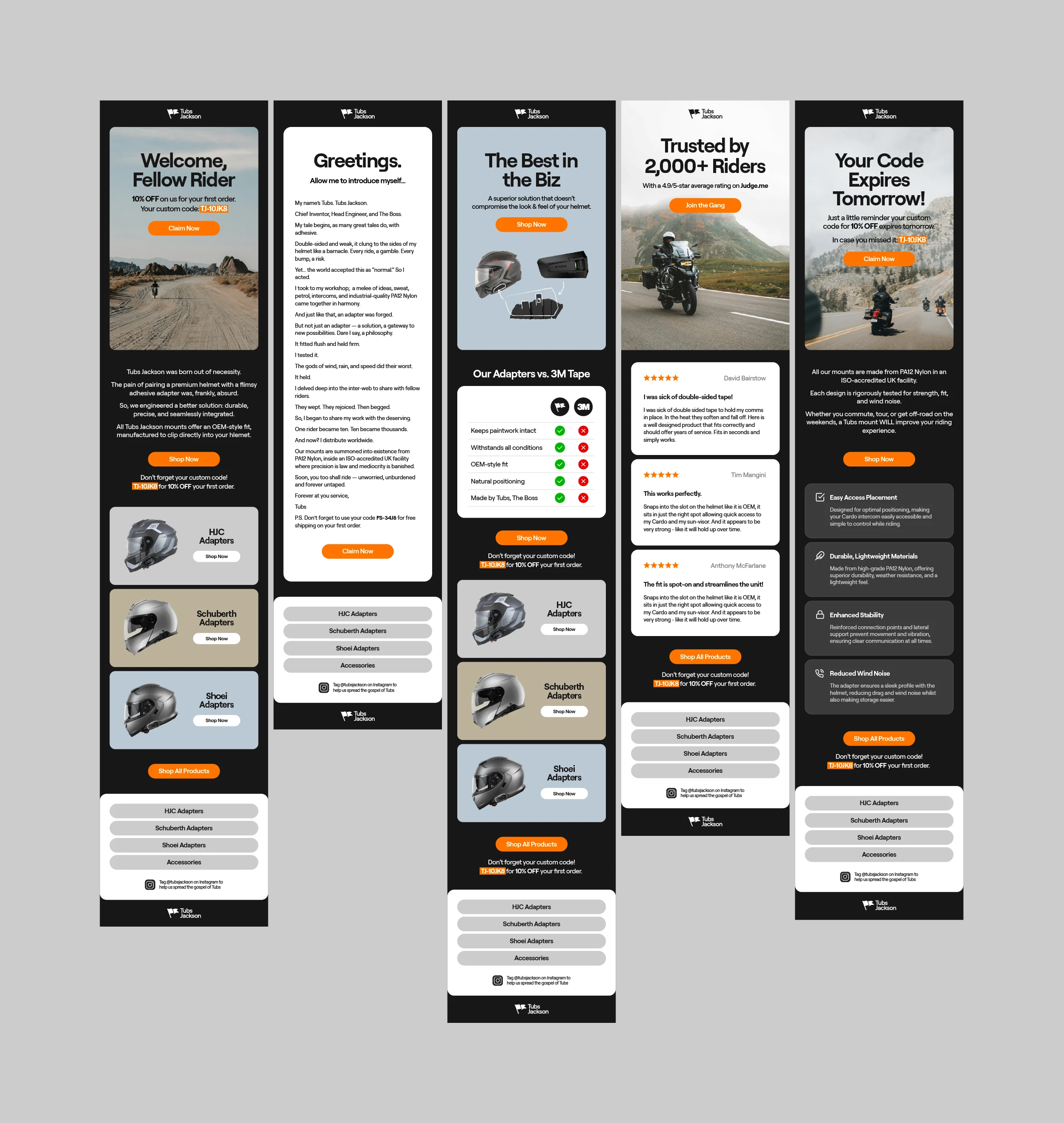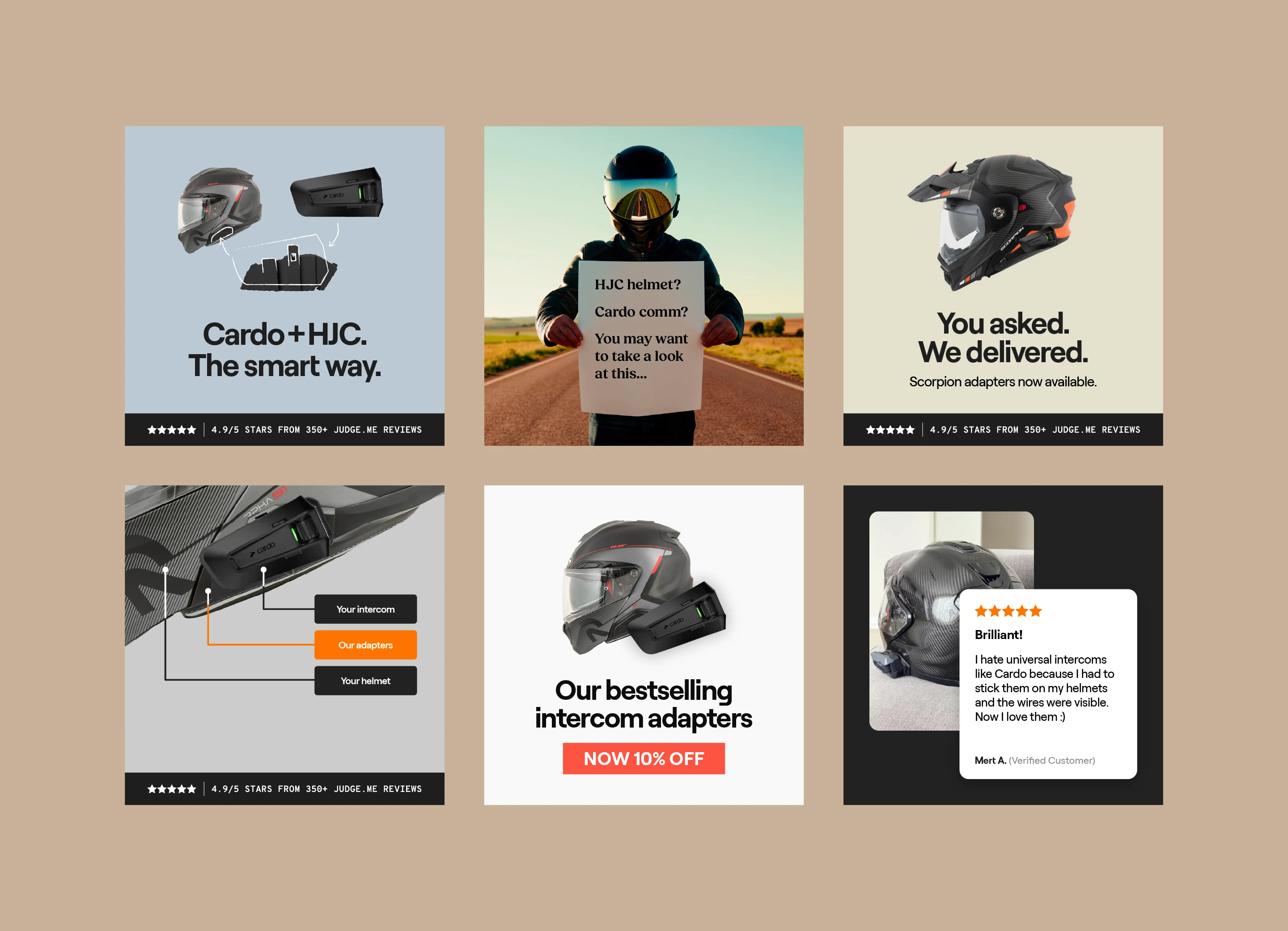 Tubs Jackson is a DTC motorcycle accessories brand specialising in 3D-printed intercom adapters. Having built up a steady stream of sales through organic marketing, Tubs was keen to capitalise on summer demand by investing in performance marketing. We helped with the strategy, execution, and management of a Meta Ads campaign, alongside refinements to brand and website.